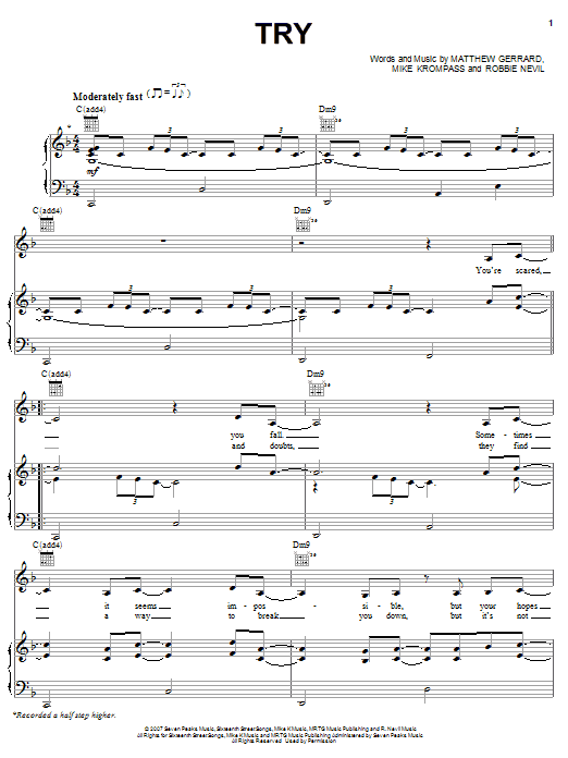 Download or print Hayden Panettiere Try sheet music, chords and digital score arranged for Piano, Vocal & Guitar Chords (Right-Hand Melody). This Film/TV score includes 8 page(s).