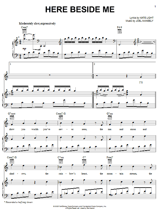 Download or print Hayley Westenra Here Beside Me sheet music, chords and digital score arranged for Piano, Vocal & Guitar Chords (Right-Hand Melody). This Film/TV score includes 4 page(s).