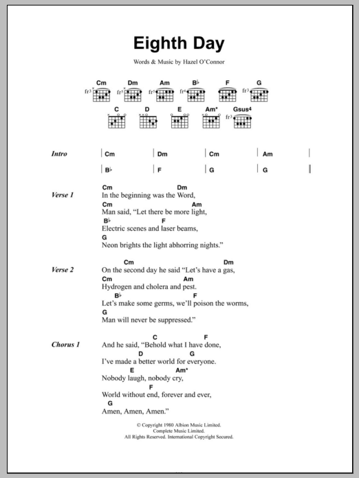 Download or print Hazel O'Connor Eighth Day sheet music, chords and digital score arranged for Guitar Chords/Lyrics. This Rock score includes 2 page(s).
