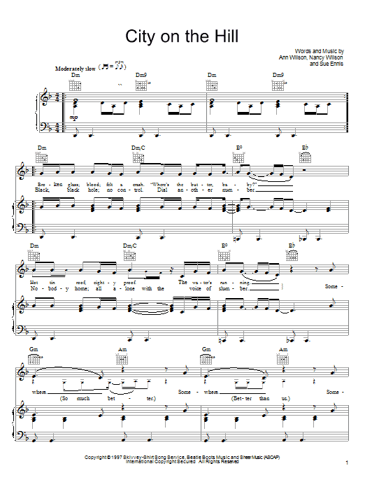 Download or print Heart City On The Hill sheet music, chords and digital score arranged for Piano, Vocal & Guitar Chords (Right-Hand Melody). This Pop score includes 4 page(s).