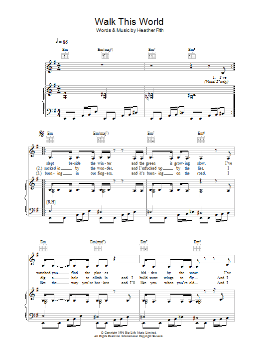 Download or print Heather Nova Walk This World sheet music, chords and digital score arranged for Guitar Chords/Lyrics. This Rock score includes 3 page(s).