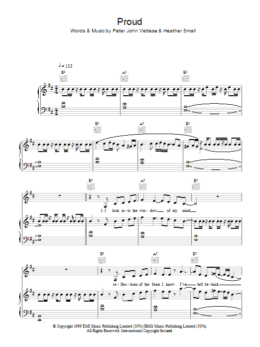 Download or print Heather Small Proud sheet music, chords and digital score arranged for Piano, Vocal & Guitar Chords (Right-Hand Melody). This Pop score includes 6 page(s).