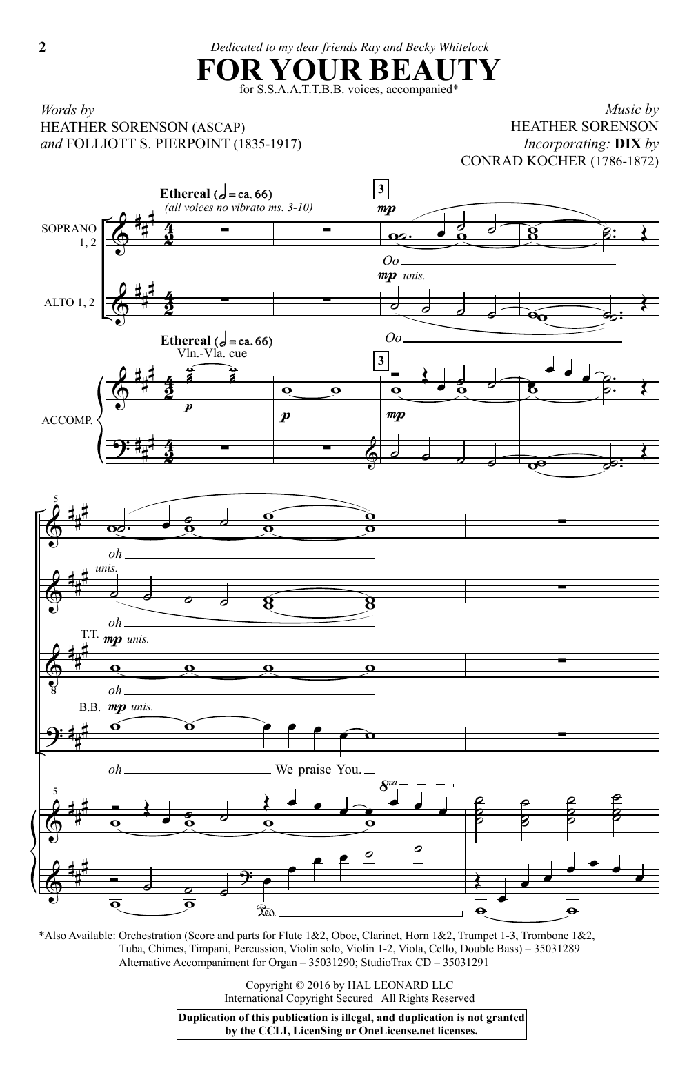 Download or print Heather Sorenson For Your Beauty sheet music, chords and digital score arranged for SATB Choir. This Sacred score includes 15 page(s).