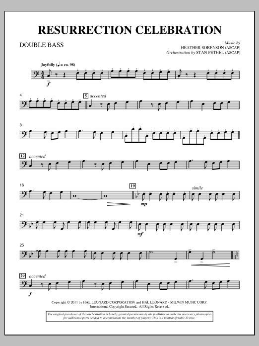 Download or print Heather Sorenson Resurrection Celebration - Double Bass sheet music, chords and digital score arranged for Choir Instrumental Pak. This Easter score includes 2 page(s).