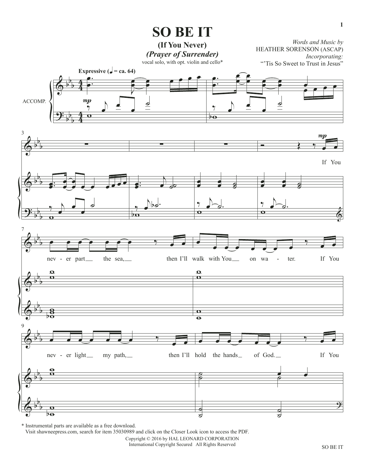 Download or print Heather Sorenson So Be It (If You Never) (from The Prayer Project) sheet music, chords and digital score arranged for Piano & Vocal. This Sacred score includes 8 page(s).