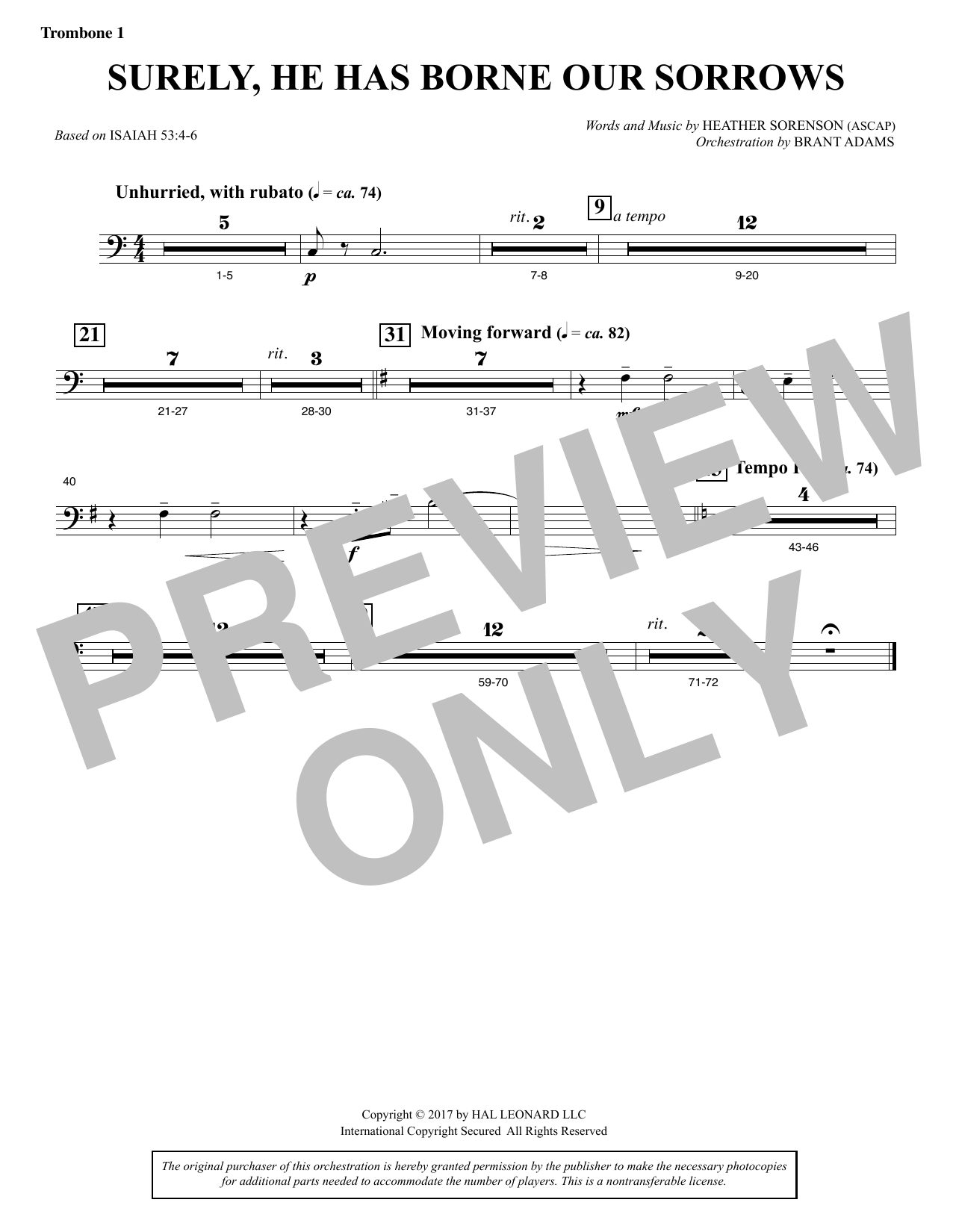 Download or print Heather Sorenson Surely, He Has Borne Our Sorrows - Trombone 1 sheet music, chords and digital score arranged for Choir Instrumental Pak. This Sacred score includes 1 page(s).