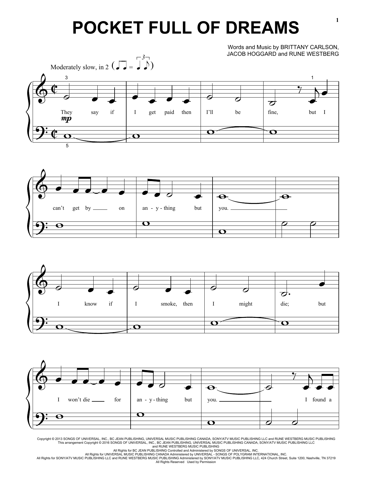 Download or print Jacob Hoggard Pocket Full Of Dreams sheet music, chords and digital score arranged for Beginning Piano Solo. This Pop score includes 4 page(s).