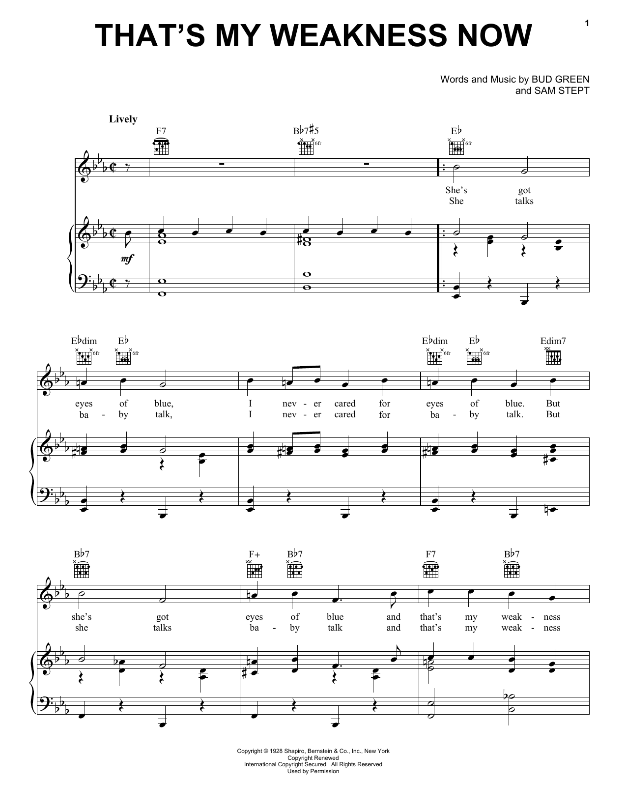 Download or print Helen Kane That's My Weakness Now sheet music, chords and digital score arranged for Piano, Vocal & Guitar Chords (Right-Hand Melody). This Jazz score includes 3 page(s).
