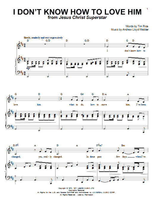 Download or print Helen Reddy I Don't Know How To Love Him sheet music, chords and digital score arranged for Piano & Vocal. This Film/TV score includes 6 page(s).