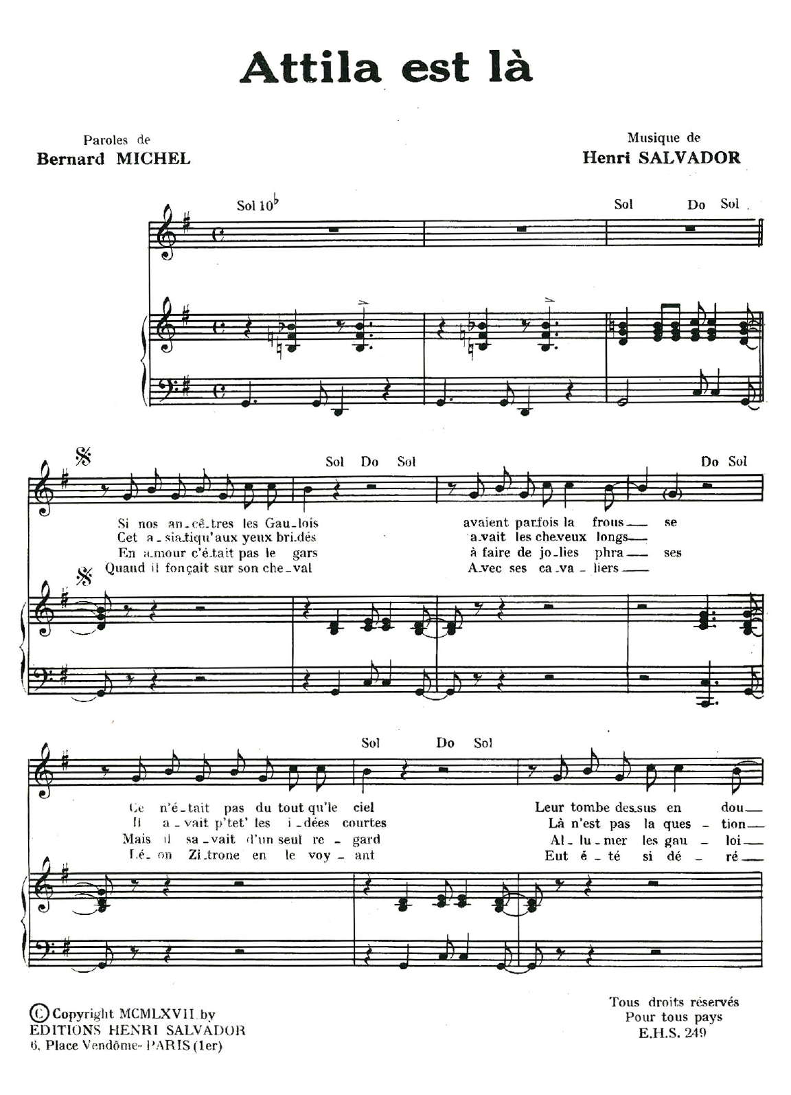 Download or print Henri Salvador Attila Est La sheet music, chords and digital score arranged for Piano & Vocal. This Pop score includes 3 page(s).