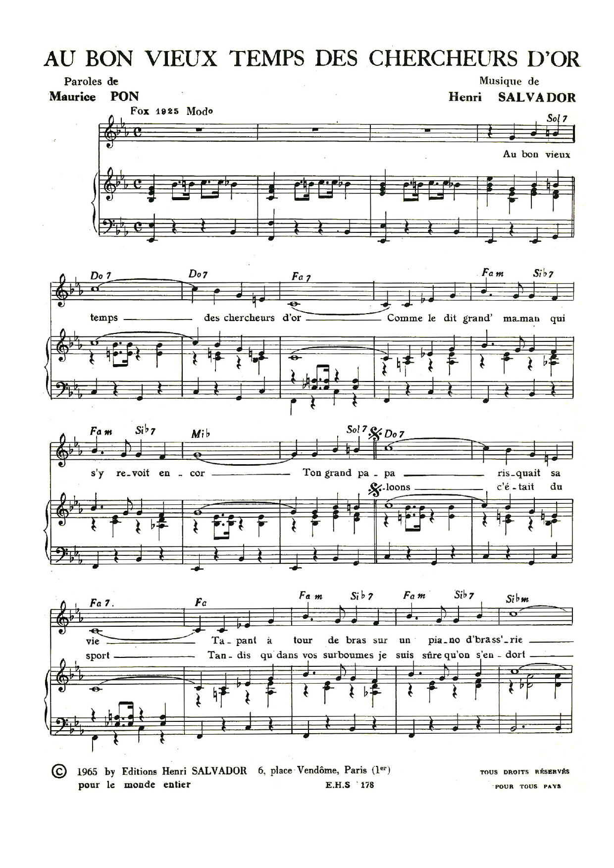 Download or print Henri Salvador Au Bon Vieux Temps Des Chercheurs D'or sheet music, chords and digital score arranged for Piano & Vocal. This Pop score includes 2 page(s).