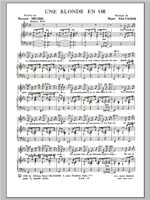 Download or print Henri Salvador Blonde En Or sheet music, chords and digital score arranged for Piano & Vocal. This Pop score includes 2 page(s).