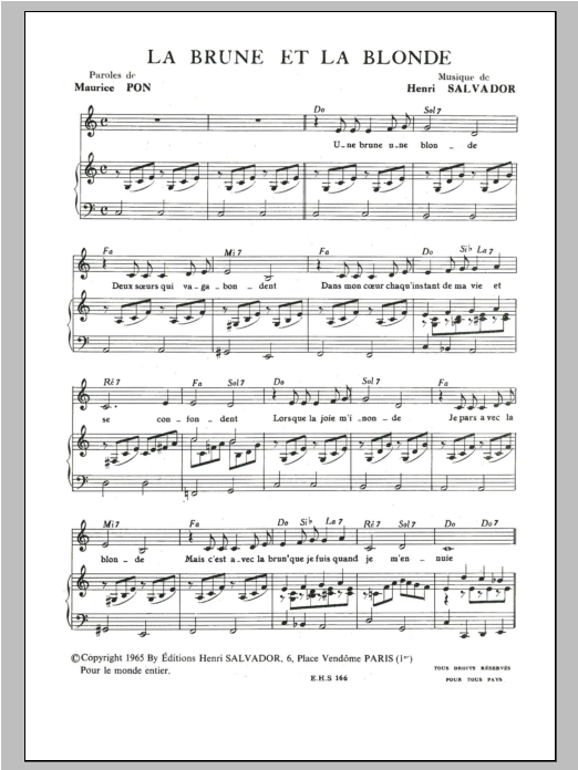 Download or print Henri Salvador Brune Et La Blonde sheet music, chords and digital score arranged for Piano & Vocal. This Pop score includes 2 page(s).