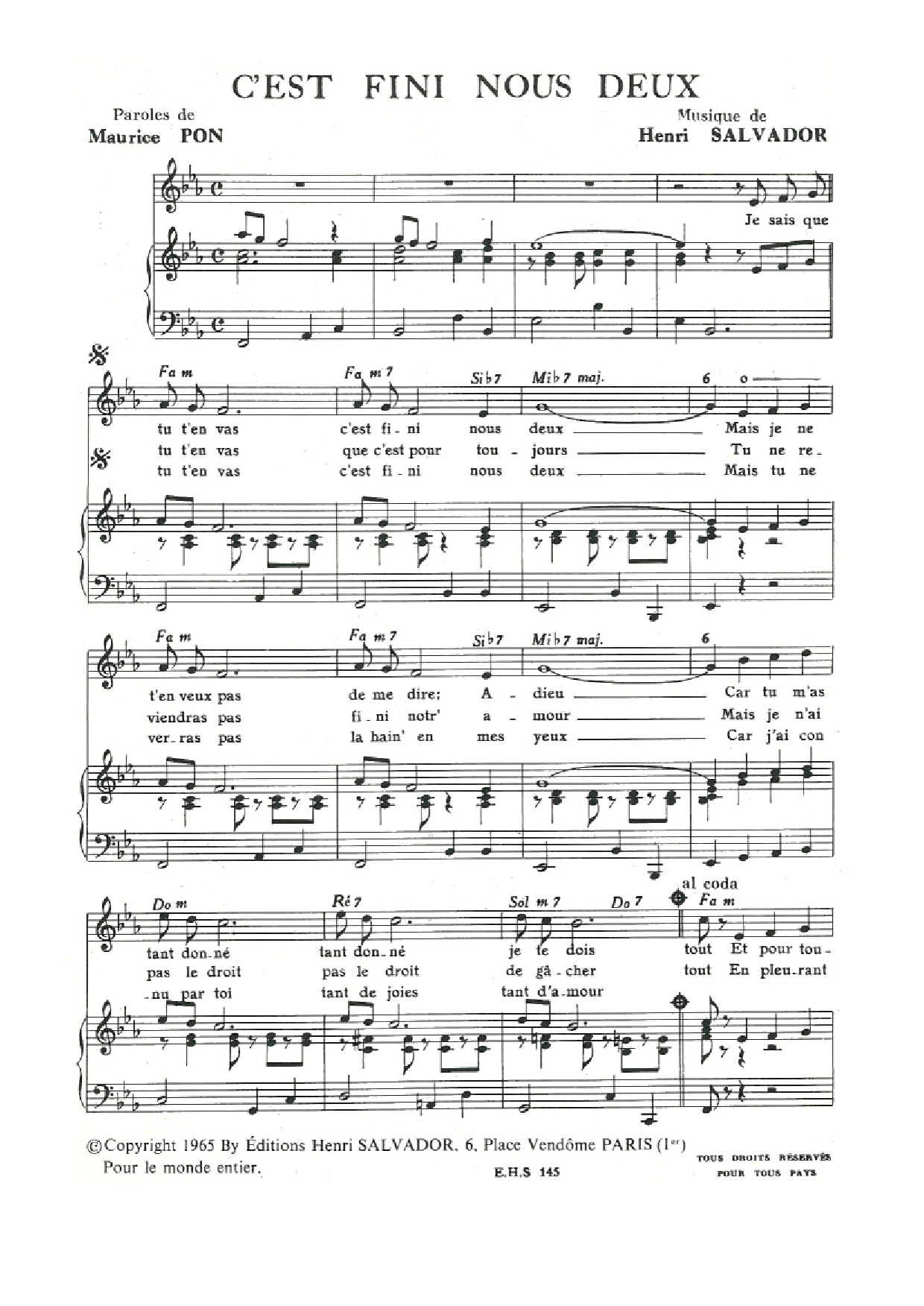 Download or print Henri Salvador C'est Fini (Pour) Nous Deux sheet music, chords and digital score arranged for Piano & Vocal. This Pop score includes 2 page(s).