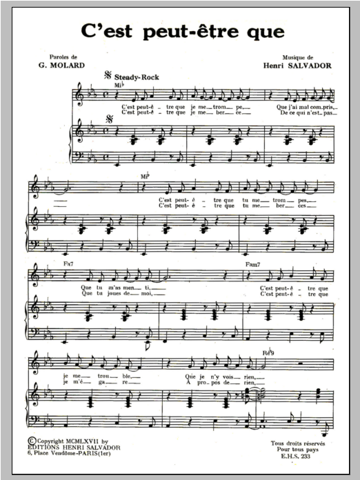 Download or print Henri Salvador C'est Peut-Etre Que sheet music, chords and digital score arranged for Piano & Vocal. This Pop score includes 2 page(s).