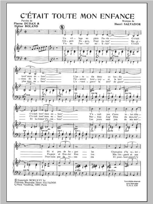 Download or print Henri Salvador C'etait Toute Mon Enfance sheet music, chords and digital score arranged for Piano & Vocal. This Pop score includes 3 page(s).