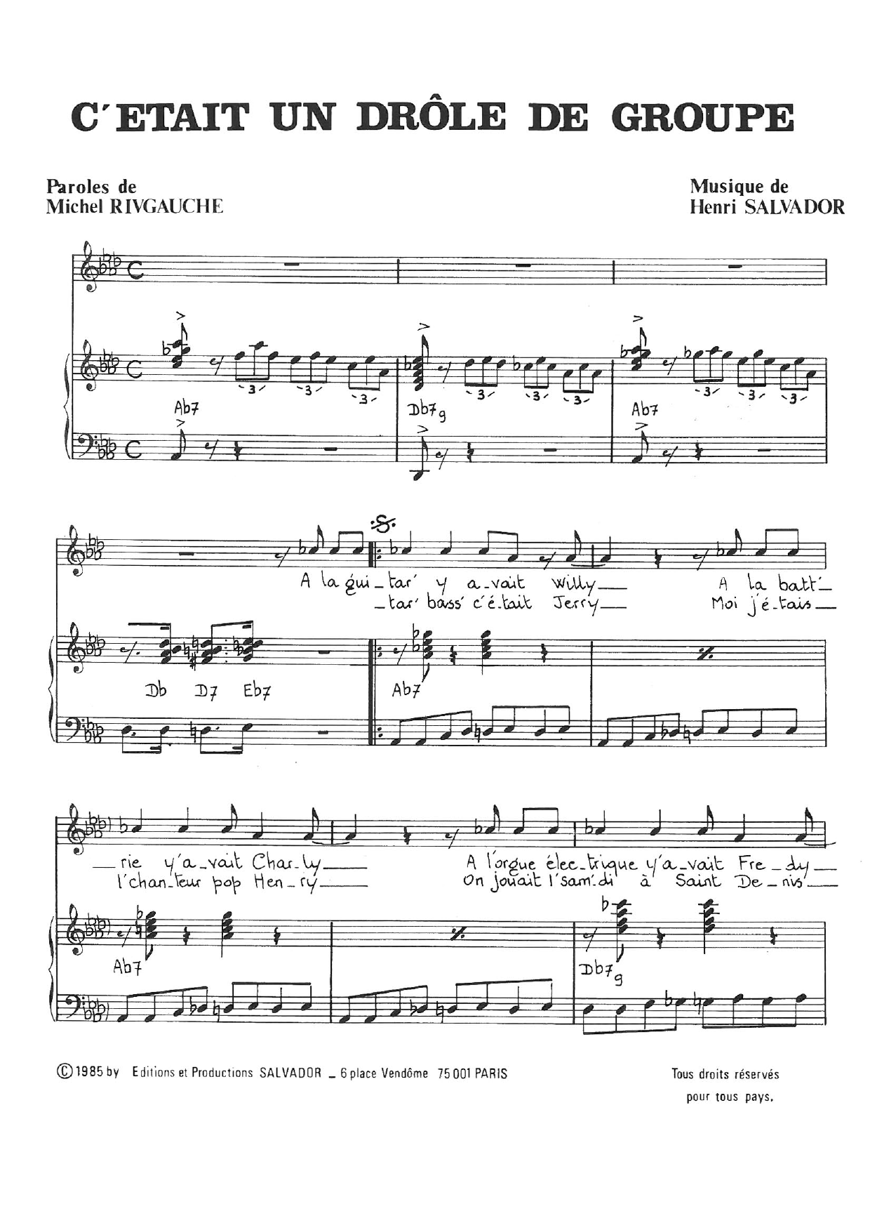 Download or print Henri Salvador C'etait Un Drole De Groupe sheet music, chords and digital score arranged for Piano & Vocal. This Pop score includes 3 page(s).
