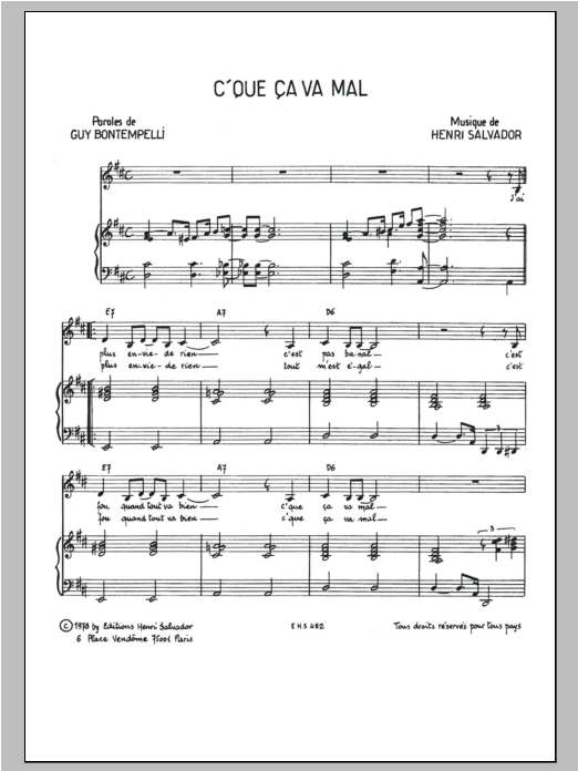 Download or print Henri Salvador C'que Ca Va Mal sheet music, chords and digital score arranged for Piano & Vocal. This Pop score includes 3 page(s).
