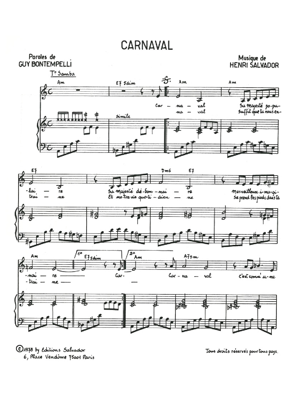 Download or print Henri Salvador Carnaval sheet music, chords and digital score arranged for Piano & Vocal. This Pop score includes 2 page(s).