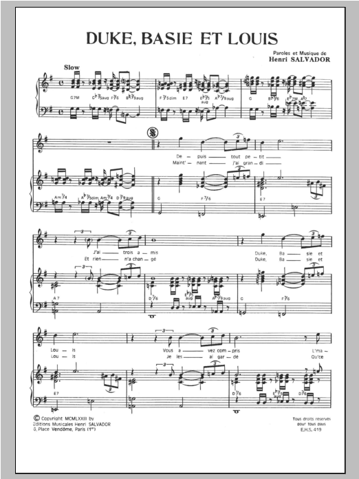 Download or print Henri Salvador Duke Basie Et Louis sheet music, chords and digital score arranged for Piano & Vocal. This Pop score includes 2 page(s).