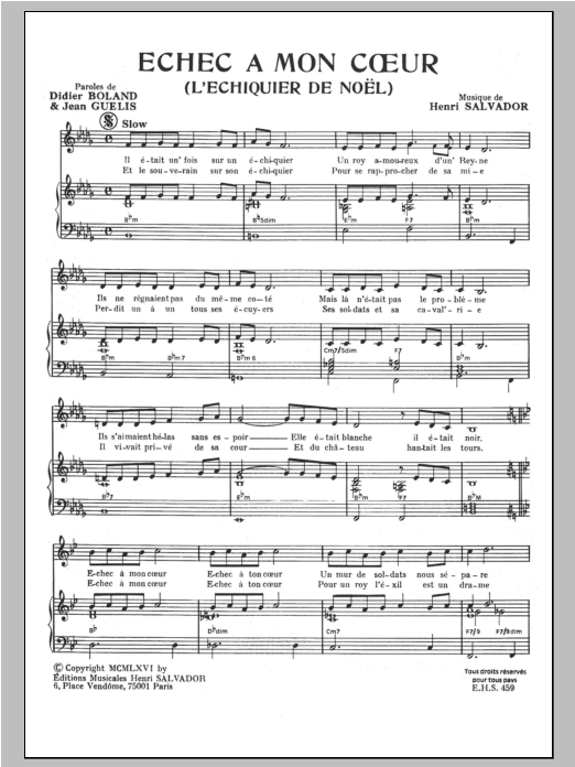 Download or print Henri Salvador Echec A Mon Coeur sheet music, chords and digital score arranged for Piano & Vocal. This Pop score includes 2 page(s).