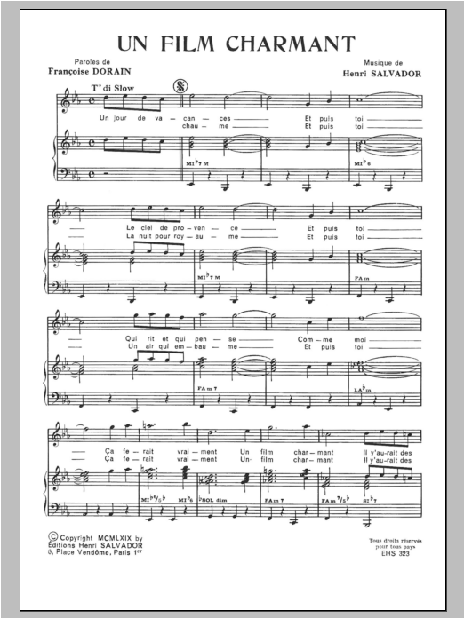 Download or print Henri Salvador Film Charmant sheet music, chords and digital score arranged for Piano & Vocal. This Pop score includes 2 page(s).