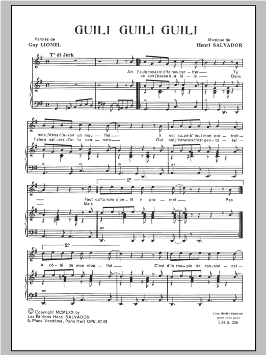 Download or print Henri Salvador Guili Guili sheet music, chords and digital score arranged for Piano & Vocal. This Pop score includes 3 page(s).