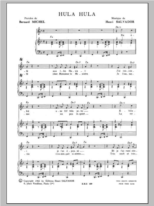 Download or print Henri Salvador Hula Hula sheet music, chords and digital score arranged for Piano & Vocal. This Pop score includes 3 page(s).