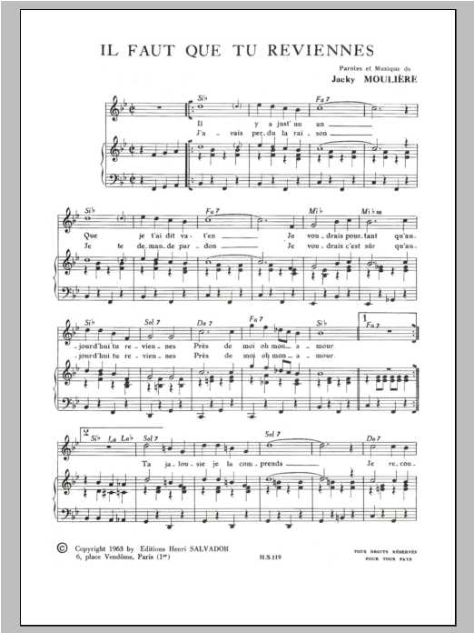Download or print Henri Salvador Il Faut Que Tu Reviennes sheet music, chords and digital score arranged for Piano & Vocal. This Pop score includes 3 page(s).