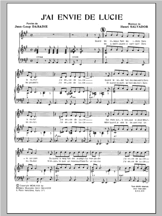 Download or print Henri Salvador J'ai Envie De Lucie sheet music, chords and digital score arranged for Piano & Vocal. This Pop score includes 3 page(s).