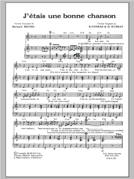 Download or print Henri Salvador J'etais Une Bonne Chanson (I Was A Good Song) sheet music, chords and digital score arranged for Piano & Vocal. This Pop score includes 3 page(s).