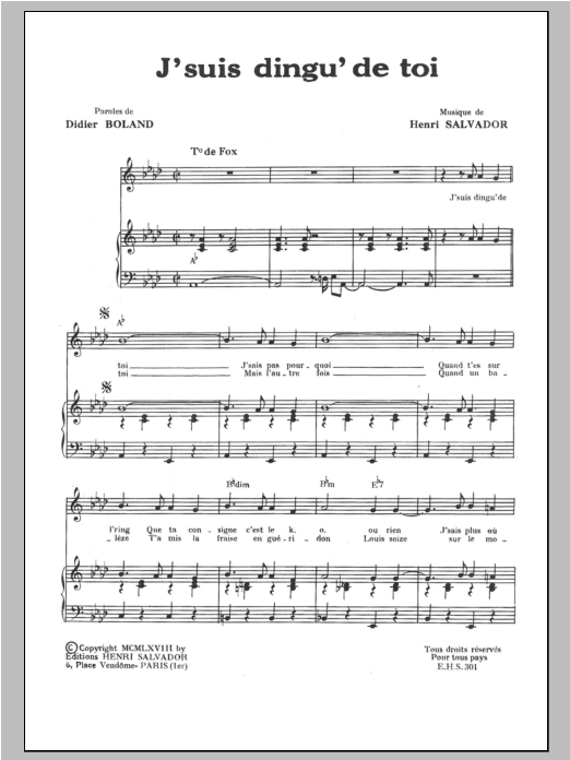 Download or print Henri Salvador J Suis Ding De Toi (Aka J'suis Dingu' De Toi) sheet music, chords and digital score arranged for Piano & Vocal. This Pop score includes 3 page(s).