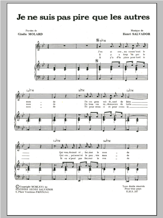 Download or print Henri Salvador Je Ne Suis Pas Pire Que Les Autres sheet music, chords and digital score arranged for Piano & Vocal. This Pop score includes 3 page(s).