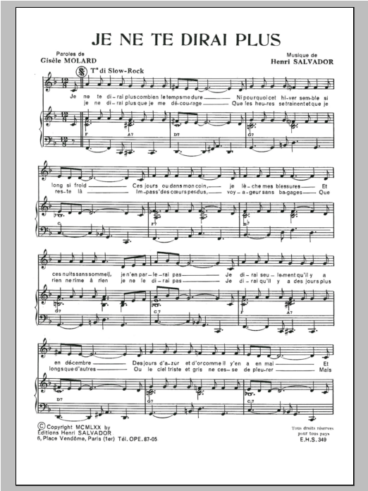 Download or print Henri Salvador Je Ne Te Dirai Plus sheet music, chords and digital score arranged for Piano & Vocal. This Pop score includes 2 page(s).