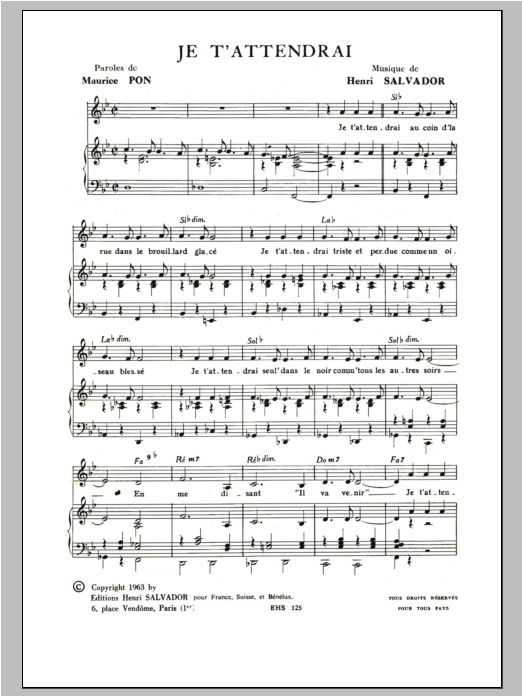 Download or print Henri Salvador Je T'attendrai sheet music, chords and digital score arranged for Piano & Vocal. This Pop score includes 3 page(s).