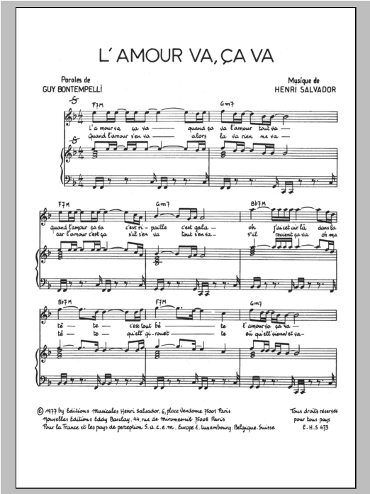 Download or print Henri Salvador L'amour Va Ca Va sheet music, chords and digital score arranged for Piano & Vocal. This Pop score includes 2 page(s).