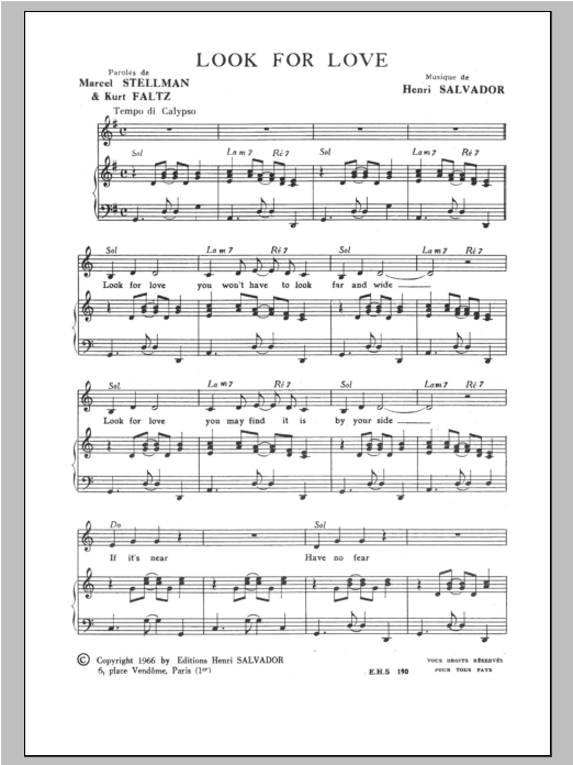 Download or print Henri Salvador Look For Love sheet music, chords and digital score arranged for Piano & Vocal. This Pop score includes 3 page(s).