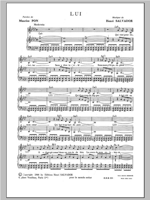 Download or print Henri Salvador Lui sheet music, chords and digital score arranged for Piano & Vocal. This Pop score includes 3 page(s).