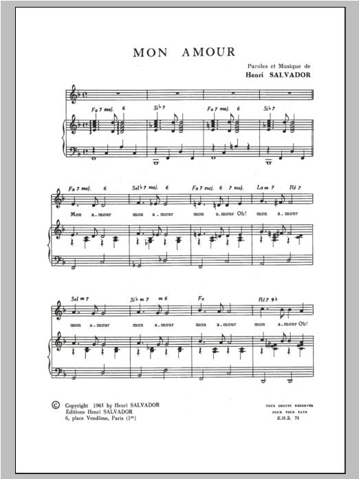 Download or print Henri Salvador Mon Amour sheet music, chords and digital score arranged for Piano & Vocal. This Pop score includes 2 page(s).