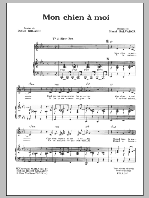 Download or print Henri Salvador Mon Chien A Moi sheet music, chords and digital score arranged for Piano & Vocal. This Pop score includes 3 page(s).