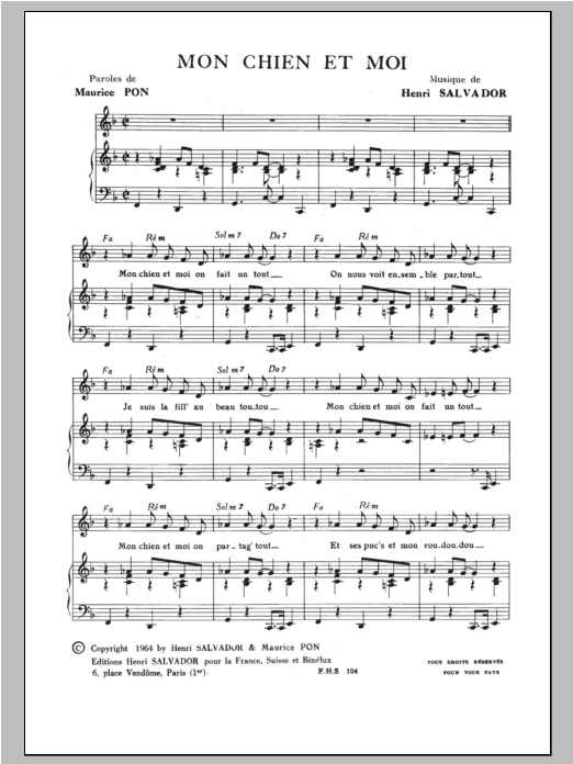Download or print Henri Salvador Mon Chien Et Moi sheet music, chords and digital score arranged for Piano & Vocal. This Pop score includes 3 page(s).