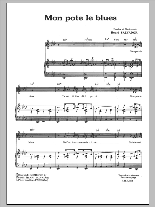 Download or print Henri Salvador Mon Pote Le Blues sheet music, chords and digital score arranged for Piano & Vocal. This Pop score includes 3 page(s).