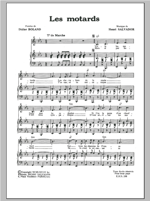 Download or print Henri Salvador Motards, Les sheet music, chords and digital score arranged for Piano & Vocal. This Pop score includes 3 page(s).