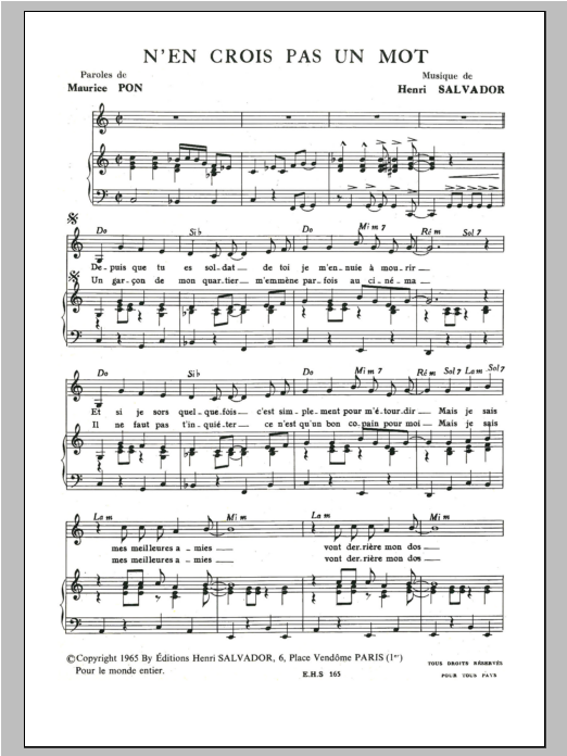 Download or print Henri Salvador N'en Crois Pas Un Mot sheet music, chords and digital score arranged for Piano & Vocal. This Pop score includes 3 page(s).