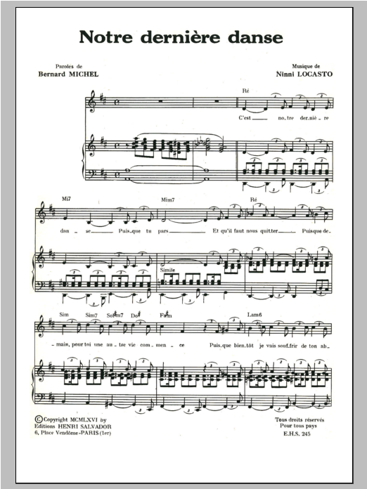 Download or print Henri Salvador Notre Derniere Danse sheet music, chords and digital score arranged for Piano & Vocal. This Pop score includes 3 page(s).