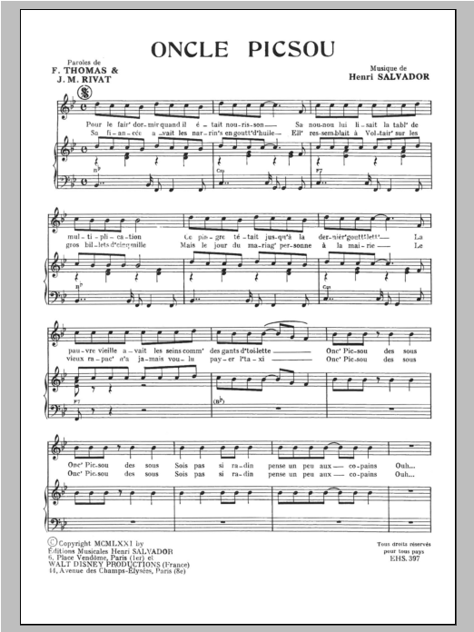 Download or print Henri Salvador Oncle Picsou sheet music, chords and digital score arranged for Piano & Vocal. This Pop score includes 2 page(s).