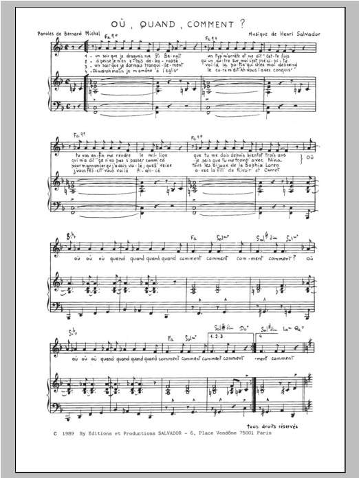 Download or print Henri Salvador Ou Quand Comment sheet music, chords and digital score arranged for Piano & Vocal. This Pop score includes 2 page(s).