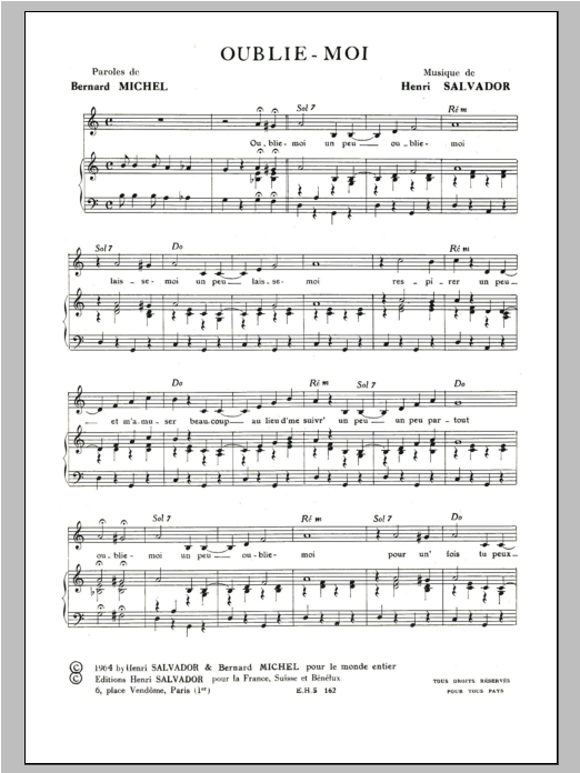 Download or print Henri Salvador Oublie Moi sheet music, chords and digital score arranged for Piano & Vocal. This Pop score includes 3 page(s).