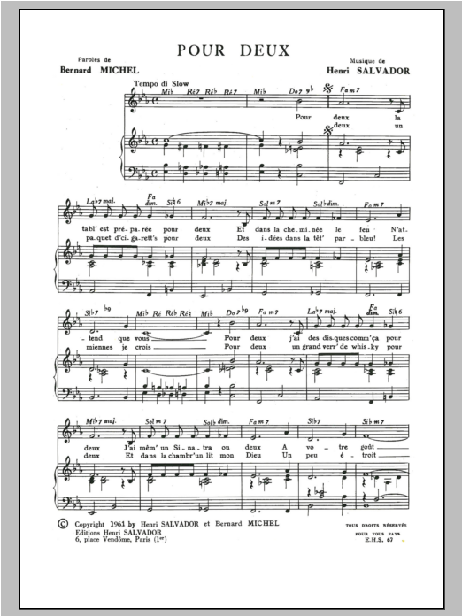 Download or print Henri Salvador Pour Deux sheet music, chords and digital score arranged for Piano & Vocal. This Pop score includes 2 page(s).