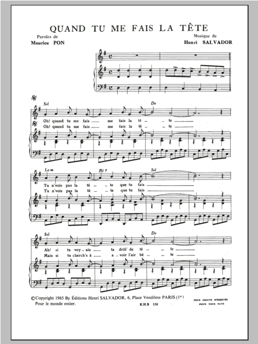 Download or print Henri Salvador Quand Tu Me Fais La Tete sheet music, chords and digital score arranged for Piano & Vocal. This Pop score includes 3 page(s).
